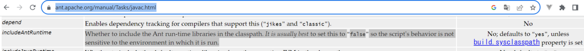 念のため、javacタスクの「includeAntRuntime」の説明を見ておきます。